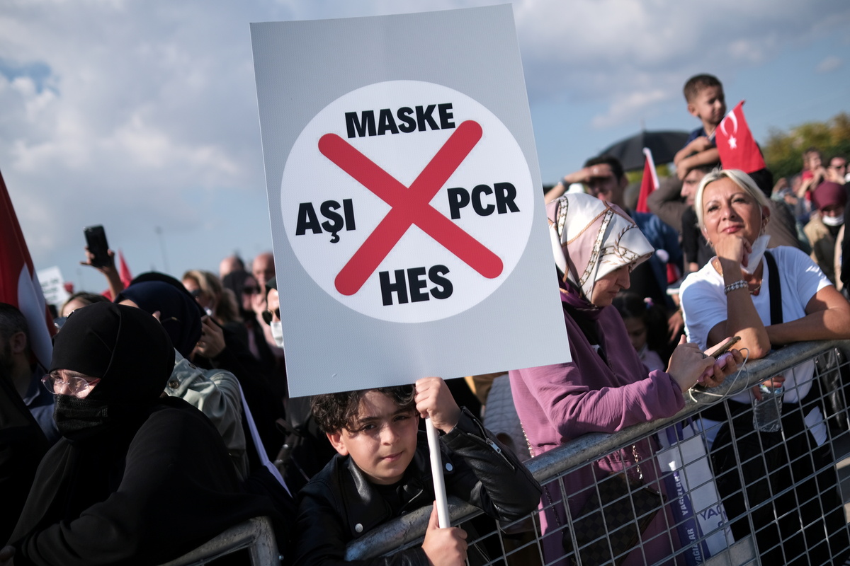 In Turkey's largest such protest, mostly maskless people shouted slogans, held placards and Turkish flags, and sang songs in defence of what they called individual rights, echoing anti-vaccine rallies in some other countries.