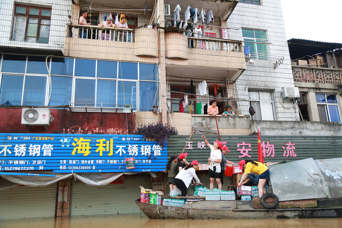 Local government personnel row a boat on a flooded street as they transport food supplies to stranded residents following heavy rainfall in Jian, Jiangxi province, China June 10, 2019. Picture taken June 10, 2019. REUTERS/Stringer