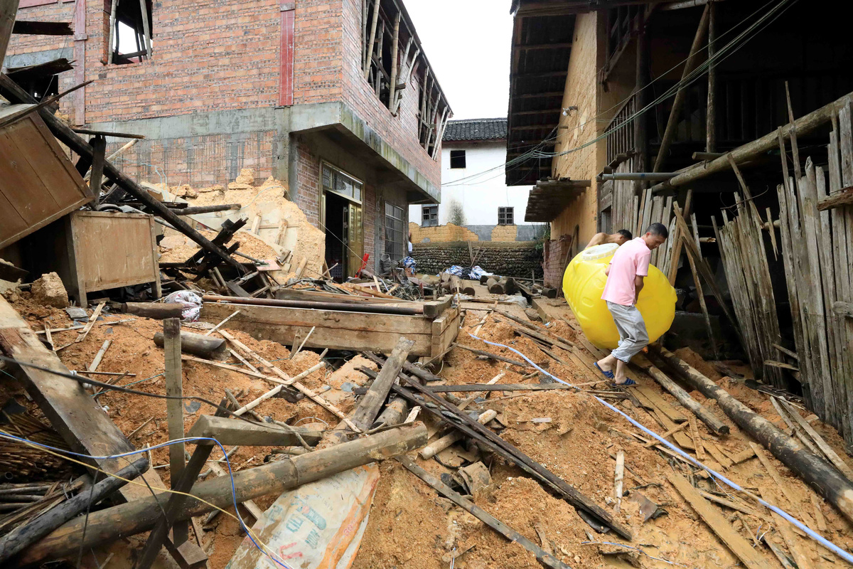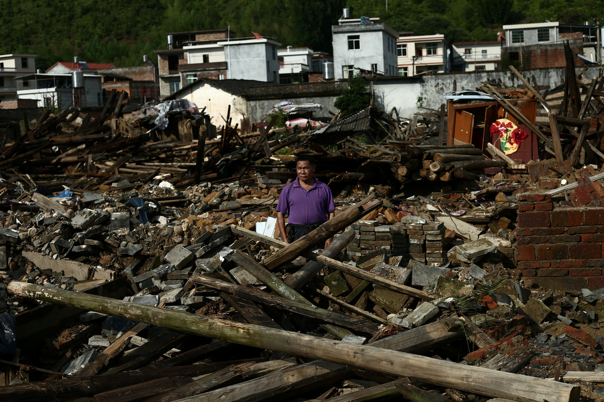 A villager stands on the debris of his house damaged by flood following heavy rainfall in Qingliu county, Sanming, Fujian province, China June 3, 2019. Picture taken June 3, 2019. REUTERS/Stringer