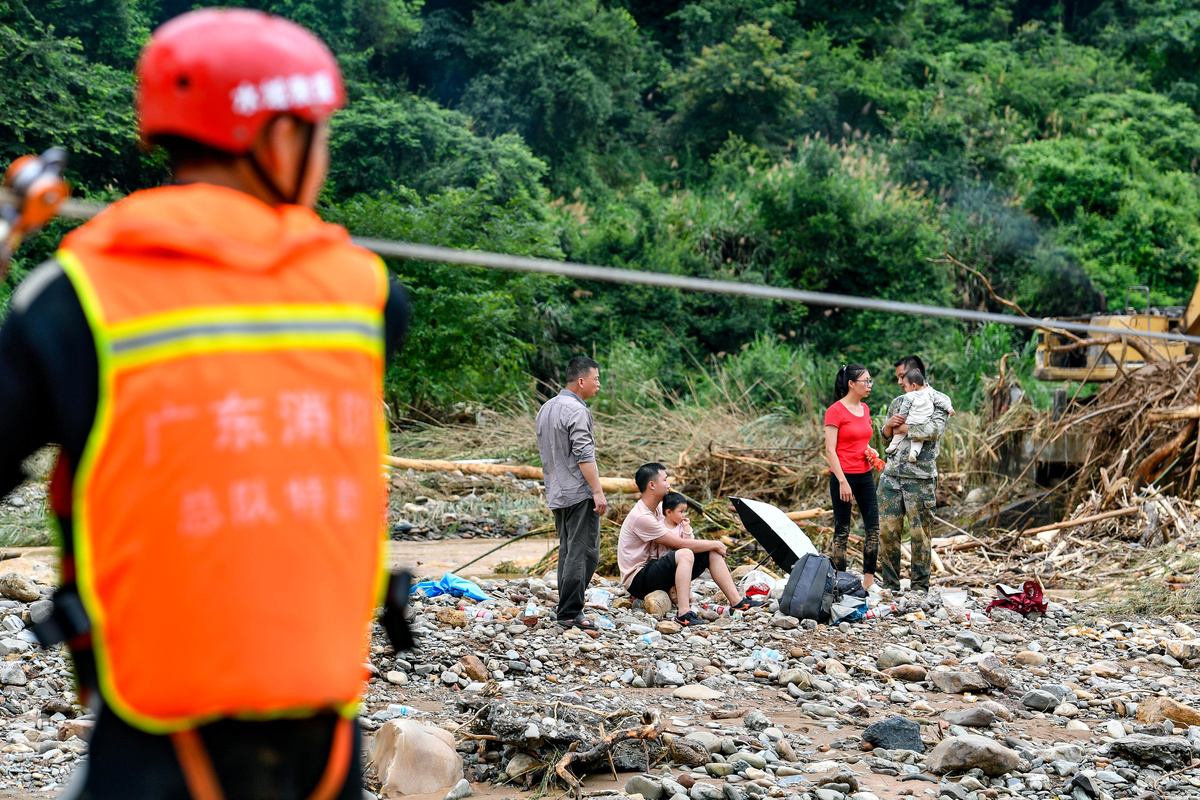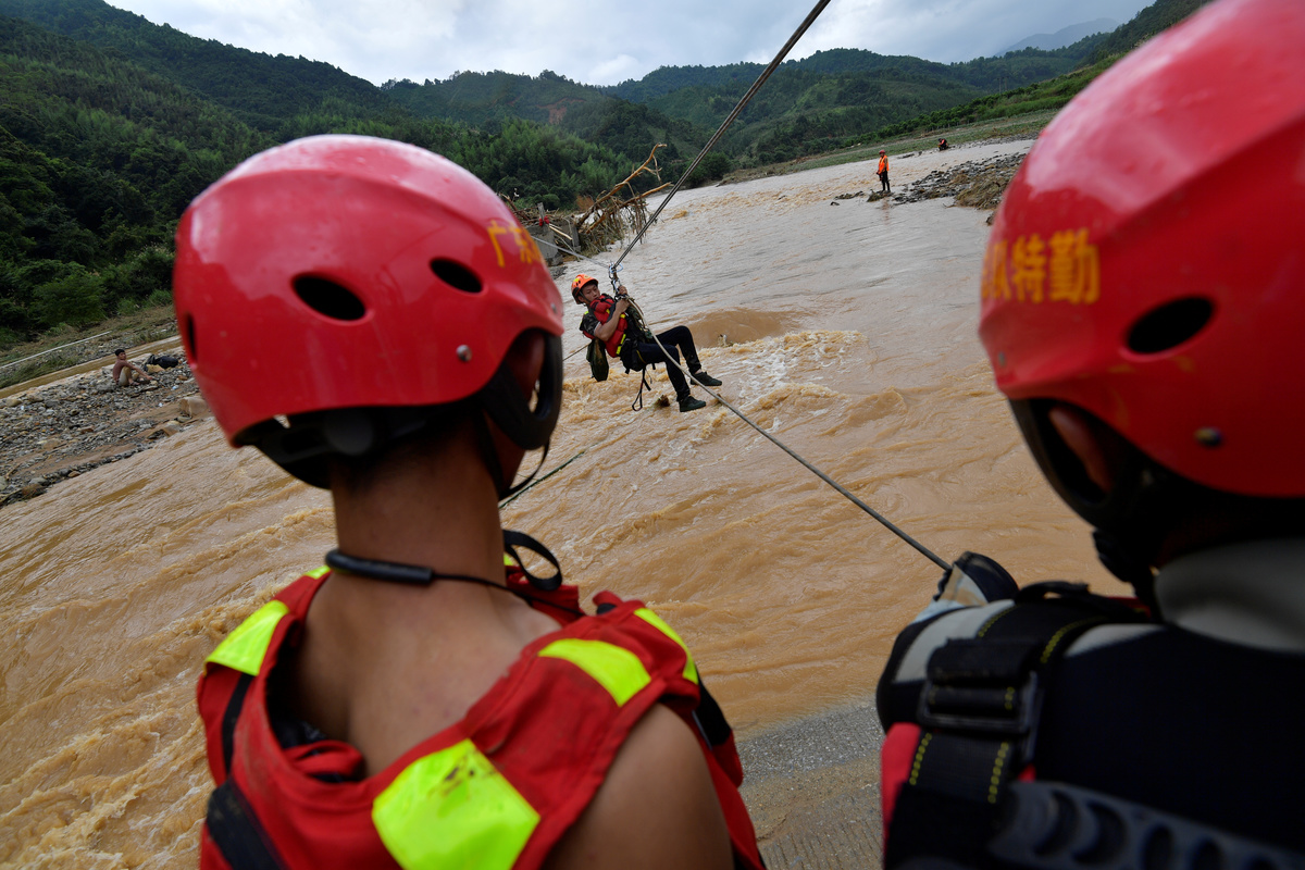 Rescue workers help evacuate stranded villagers affected by flood following heavy rainfall in Heyuan, Guangdong province, China June 11, 2019. Picture taken June 11, 2019. Chen Jimin/CNS via REUTERS Villagers clean up their belongings after their houses were damaged by flood following heavy rainfall in Rongan county, Liuzhou, Guangxi Zhuang Autonomous Region, China June 10, 2019. Picture taken June 10, 2019. REUTERS/Stringer A rescue worker crosses a river on a rope to flood-affected villages in Heyuan, Guangdong province, China June 11, 2019. Picture taken June 11, 2019.REUTERS/StringerA villager looks for her frogs at a flooded breeding farm following heavy rainfall in Quanzhou, Guilin, Guangxi Zhuang Autonomous Region, China June 10, 2019. Picture taken June 10, 2019. REUTERS/Stringer