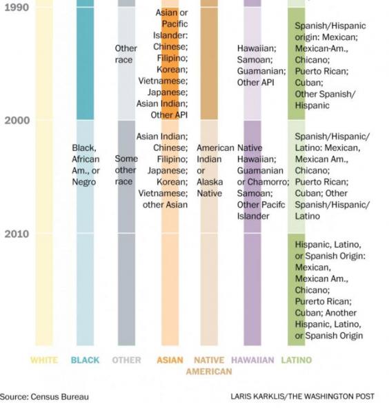 That chart is based on an interactive the Census Bureau published this week tracing the history of these changes, from the proliferation of new racial and ethnic identities (now the government counts Chicanos, Puerto Ricans, Cubans and Guatemalans) through the revision of old ones ("Indians" have become "American Indians"). Scroll down to the bottom of the page for a full timeline breaking out each label.