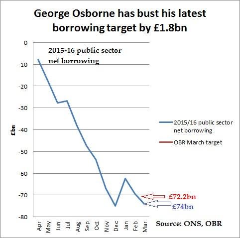 Today's public finances report from the Office for National Statistics shows that George Osborne has overshot his public borrowing target for 2015-16 by £1.8bn, despite those targets only being set by the Office for Budget Responsibility in last month's Budget: