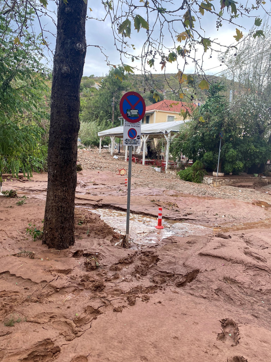 A river flooded its banks and damaged roads and a medical centre in the town of Mouzaki.