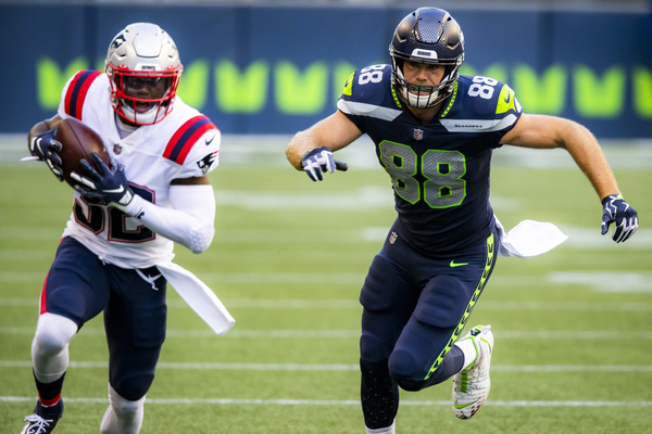 Seattle Seahawks tight end Greg Olsen loses a pick six to Patriots free safety Devin McCourty as the Seattle Seahawks take on the New England Patriots at CenturyLink Field in Seattle Sunday September 20, 2020. (Bettina Hansen/The Seattle Times/TNS)