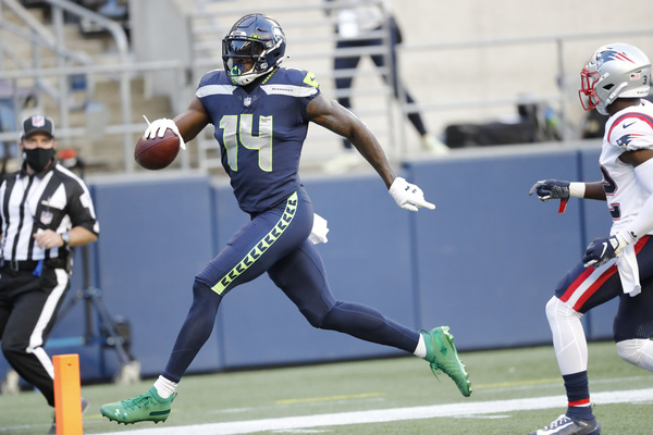 Seattle Seahawks wide receiver D.K. Metcalf catches a 54-yard pass and runs in for a touchdown in a game against New England Patriots on Sunday, September 20, 2020, at CenturyLink Field in Seattle, WA. (Dean Rutz/The Seattle Times/TNS)