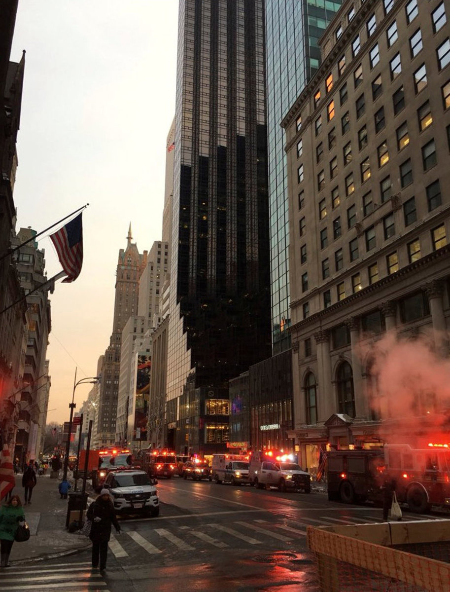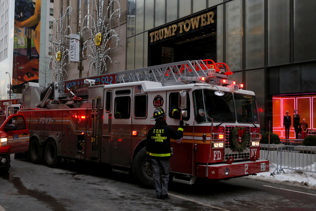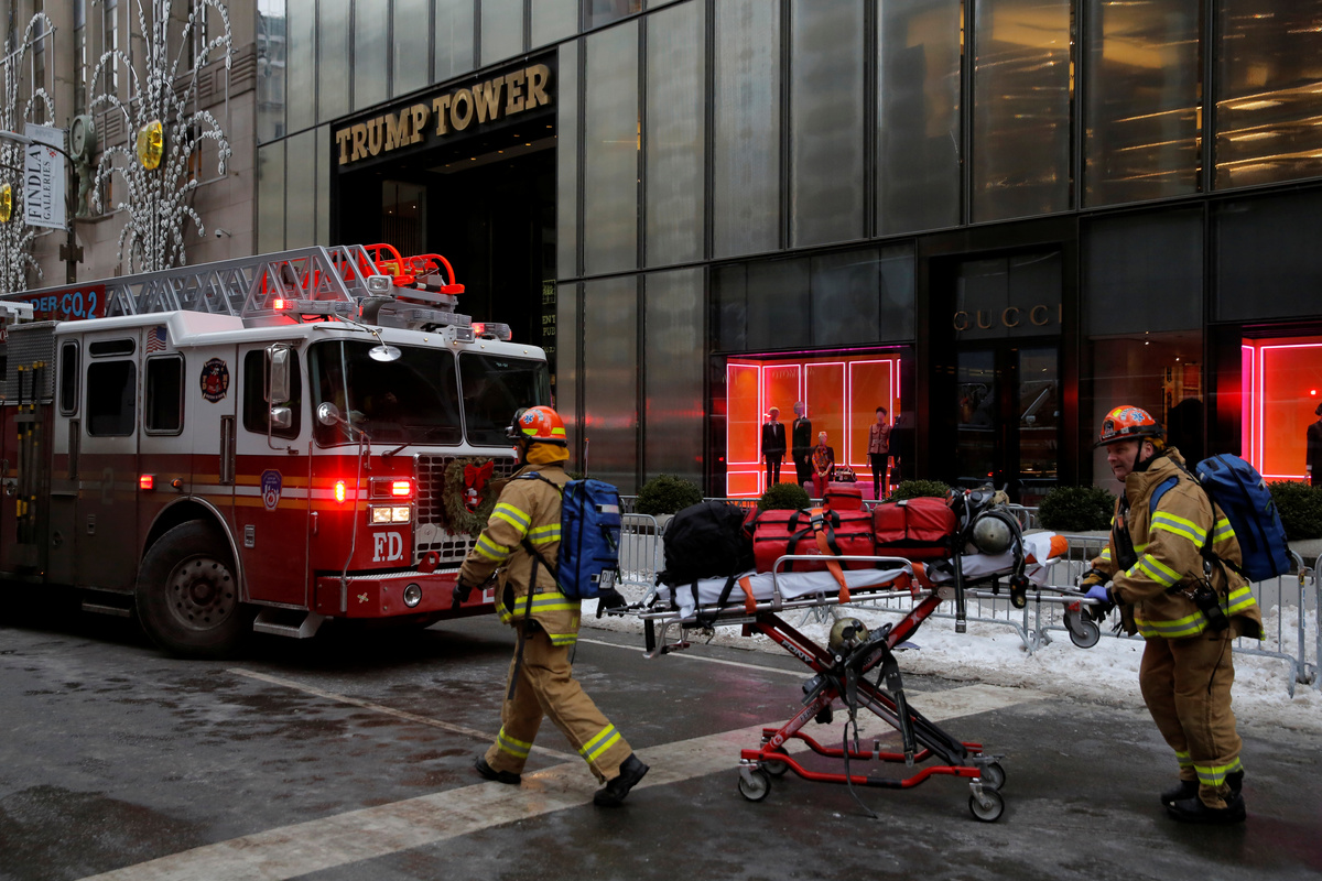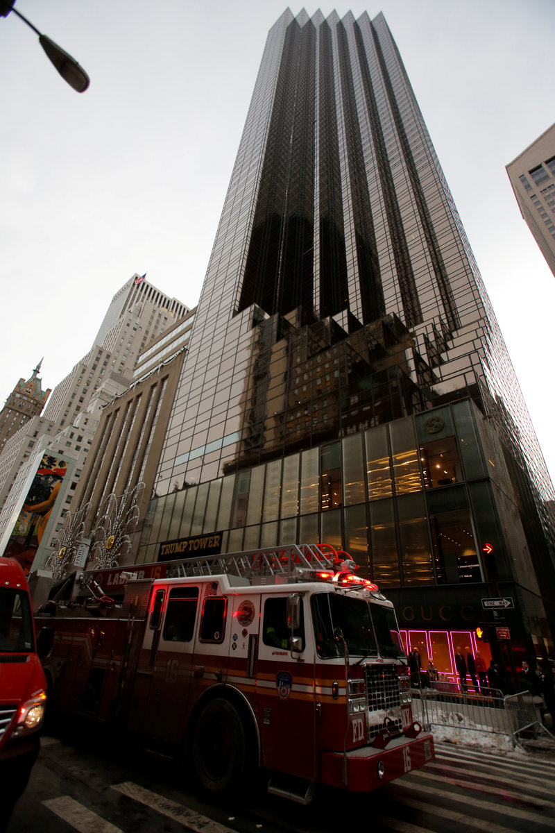 New York Fire Department crew respond after a fire broke out at Trump Tower in Manhattan, New York City, U.S. January 8, 2018. REUTERS/Andrew KellyNew York Fire Department crew respond after a fire broke out at Trump Tower in Manhattan, New York City, U.S. January 8, 2018. REUTERS/Andrew KellyNew York Police respond after a fire broke out at Trump Tower in Manhattan, New York City, U.S. January 8, 2018. REUTERS/Andrew KellyNew York Fire Department crew respond after a fire broke out at Trump Tower in Manhattan, New York City, U.S. January 8, 2018. REUTERS/Andrew KellyNew York Fire Department crew respond after a fire broke out at Trump Tower in Manhattan, New York City, U.S. January 8, 2018. REUTERS/Andrew KellyA smoke is seen rising from the roof of Trump Tower, in New York, U.S., January 8, 2018 in this still image obtained from social media video. TWITTER/@NYCBMD/via REUTERSFire crews are seen at base of Trump Tower, in New York, U.S., January 8, 2018 in this picture obtained from social media. Twitter/@oinonio/via REUTERSA smoke coming out of Trump Tower as seen from building next to it, in New York City, U.S., January 8, 2018 in this still image obtained from social media video. INSTAGRAM/@SLIMADOS/via REUTERSA smoke coming out of Trump Tower as seen from building next to it, in New York City, U.S., January 8, 2018 in this still image obtained from social media video. INSTAGRAM/@SLIMADOS/via REUTERS