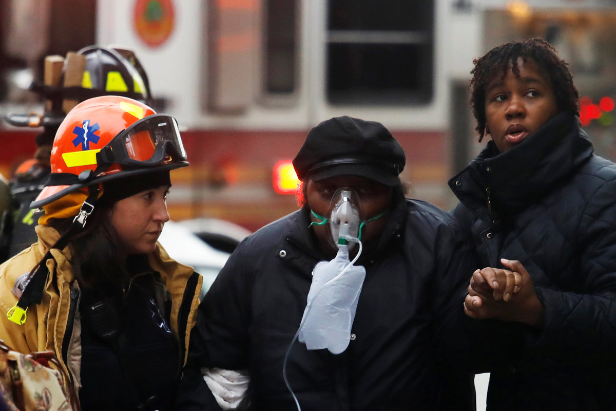 A woman walks with a breathing mask, assisted by a girl and an Emergency Medical Technician (EMT), after being evacuated from a five-alarm fire in Manhattan, New York City, U.S., January 8, 2018. REUTERS/Shannon Stapleton