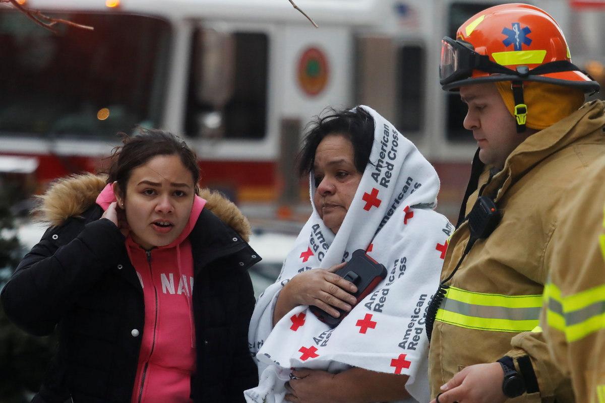 A woman and a girl are evacuated from a five-alarm fire in Manhattan, New York City, U.S., January 8, 2018. REUTERS/Shannon Stapleton