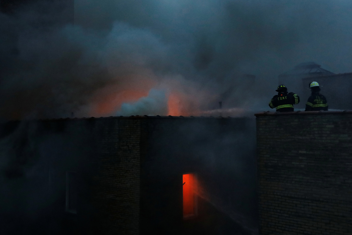 Fire Department of New York (FDNY) firefighters work on a five-alarm fire in Manhattan, New York City, U.S., January 8, 2018. REUTERS/Shannon Stapleton