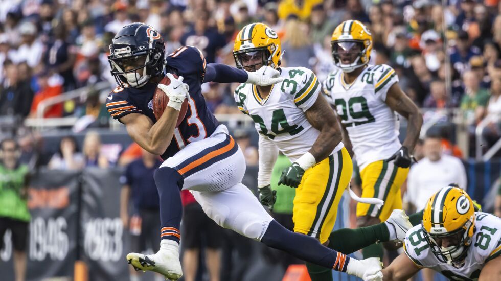 With receiver Darnell Mooney concussed and tight end Cole Kmet limited by a knee injury last week against the Falcons, receiver DJ Moore accounted for 159 of the Bears’ 268 receiving yards. The Bears need to be more diverse in their pass game against the Packers, whether it’s with quarterback Justin Fields throwing to Kmet — who played mostly run-blocking downs last week — or someone else. One suggestion: rookie Tyler Scott, whom the Bears feel is close to a breakout.