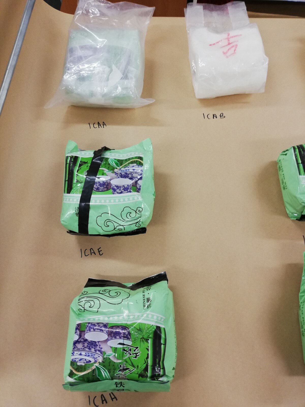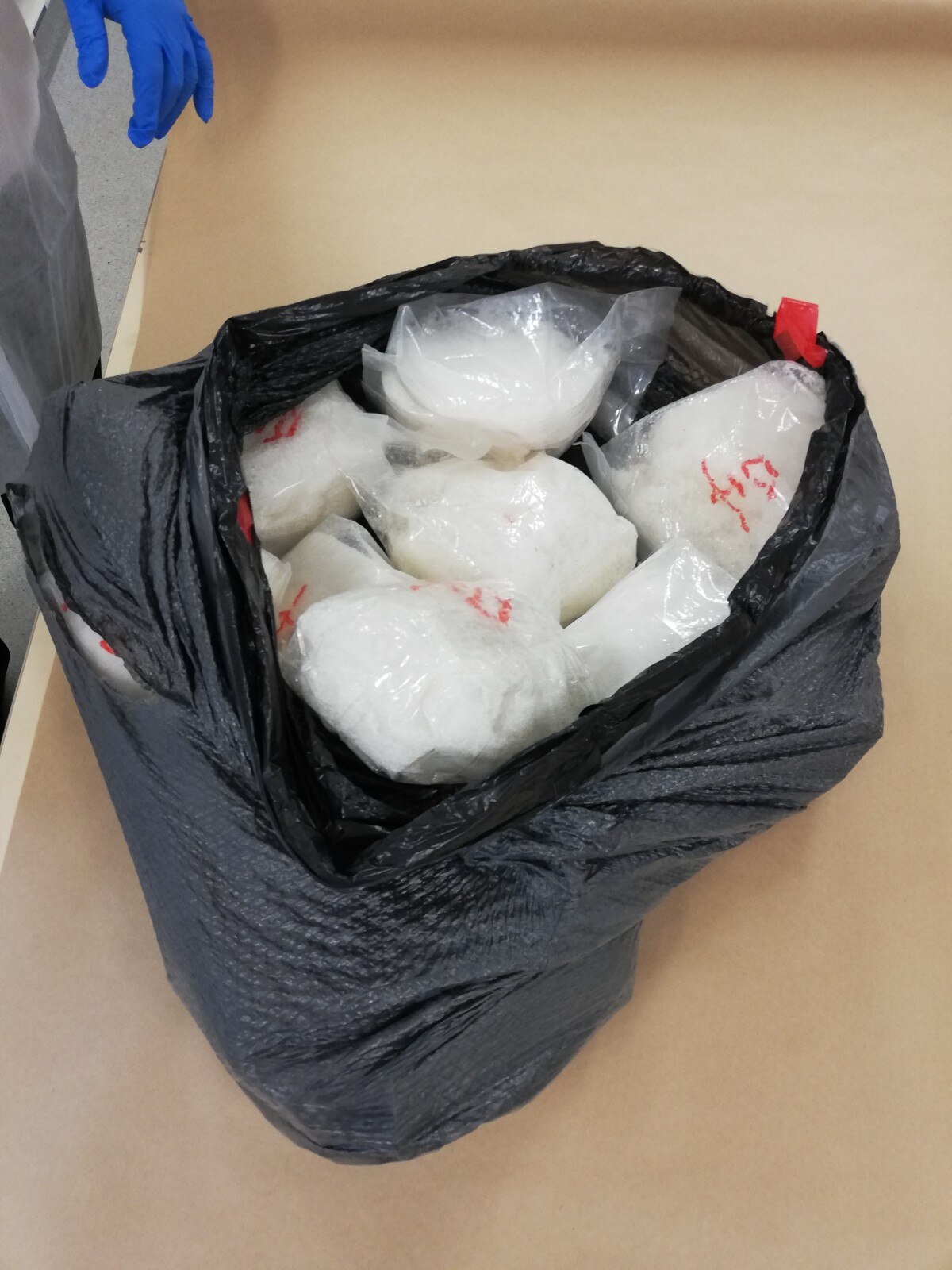 They were packed in one-kilogram bags, which were wrapped in rubbish bags, put in plastic tubs, and then concealed at the back of a sea container behind carpet underlay, insulation and bubble wrap.