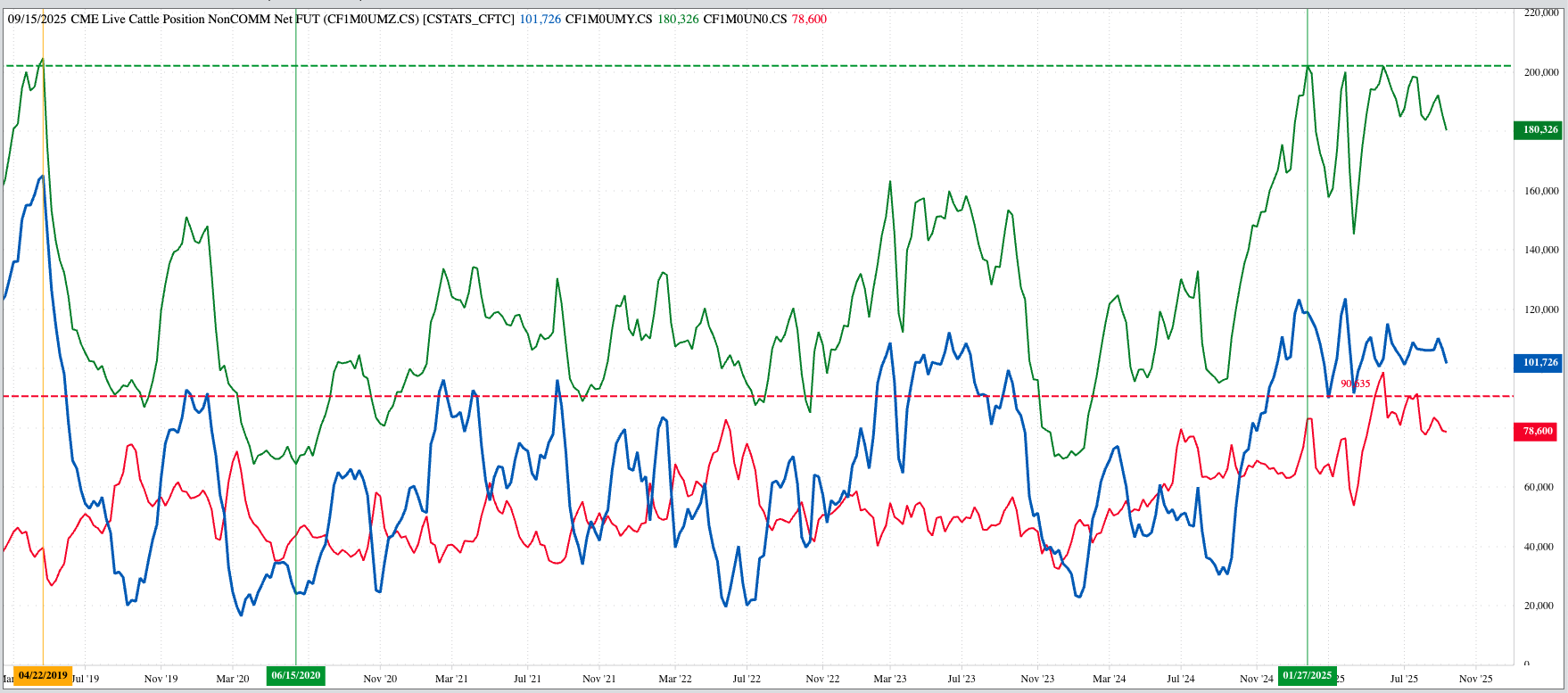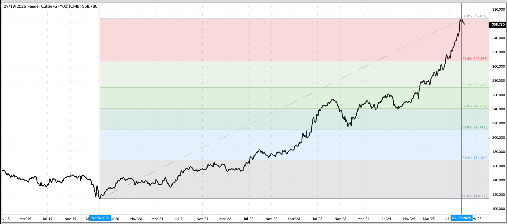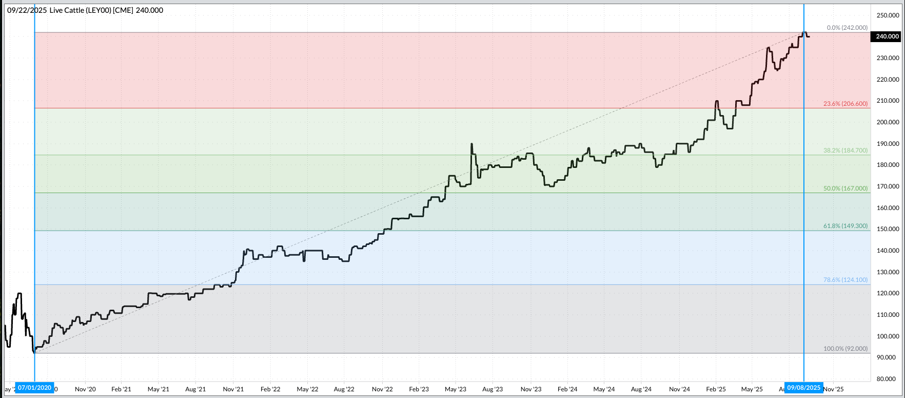 The Live Cattle Cash Index (LEY00) has moved from a low daily close of $92.00 on July 1, 2020, to a recent high daily close of $242.00 on September 8, 2025 (recognize that date?). The past couple weeks have seen the Index slip a couple dollars, last reported at $240 on Friday, September 19. Similarly, the National Feeder Cattle Index (GFY00) has risen from a low daily price of $114.23 on April 15, to a high of $367.03 on September 5, 2025. Yes, the feeder index has taken a breather of late, slipping to $358.78 on Friday, September 19, but it could be premature to say it’s all over for cash cattle.