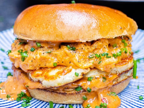 8. Time to load up. Start with a big dollop of your chilli mayo sauce, followed by 3 slices of your halloumi and finally a spoonful of your scrambled egg. Scatter over your leftover chives, season well and tuck in!