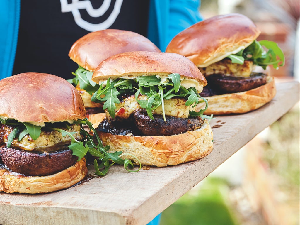 5. To assemble the burgers, place a mushroom, flat side up, on the base of each burger bun. Top with a halloumi steak and add a spoonful of sweet chilli or hot chilli sauce. Pile a big handful of rocket leaves on top. Spread some mayo on the bun lids and sandwich the burgers together. Tuck in straight away.