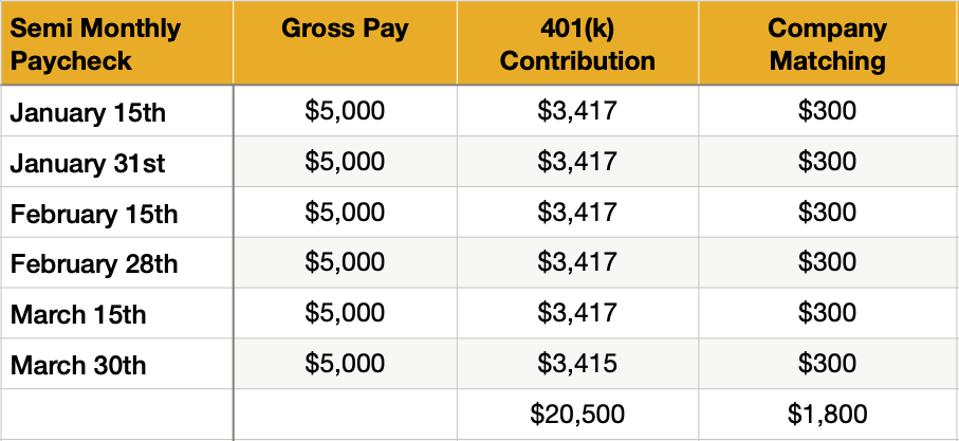 Remember, the company match is calculated as dollar for dollar up to the first 6% you contribute. The first 6% percent of a $5,000 semi-monthly paycheck is $300. Unfortunately, that is the way the matching math works. When you max out your 401(k) contributions early, you will likely leave behind 401(k) matching dollars. In this case, the individual maxed out in three months, and received $1,800 in matching. This leaves $5,400 on the table in company matching dollars. You can rerun the example where you max out in six months, nine months, etc., you will still come up short regardless.