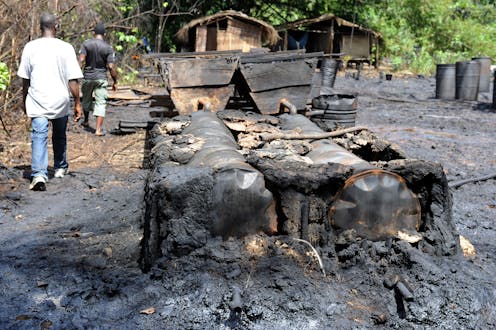 Illegal petroleum refineries are mainly located in the forest or in villages. Illegal operators break crude oil pipelines and load the stolen oil into tankers or channel it to tanks where it is boiled.