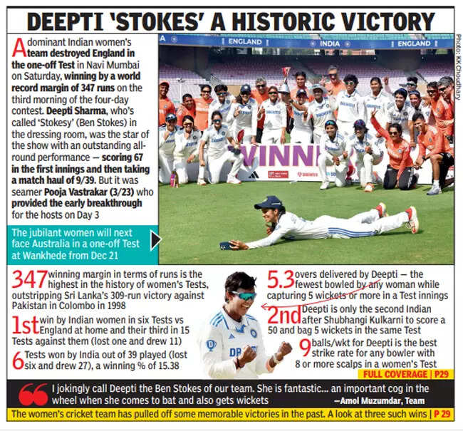 As India beat England by 347 runs in the one-off Test, which is the biggest margin of victory by runs in women's Test cricket, TOI takes a look at the three memorable Test wins for India.