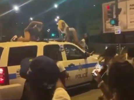 In footage of a gathering over the weekend, a police vehicle drives through a crowd of people with three women twerking on it. One woman is on the car’s roof and the other two women are on all fours on the hood. The rest of the crowd is filming the car, who is being driven by another person.