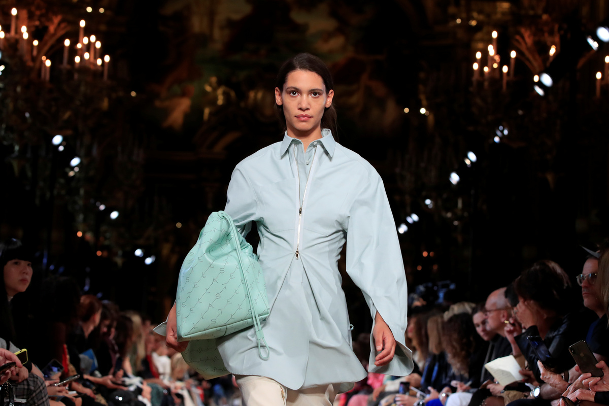 Known for her environmentally-friendly approach to fashion, McCartney's latest outing featured a ruffled shell suit in recycled nylon and handbags made from faux leather.