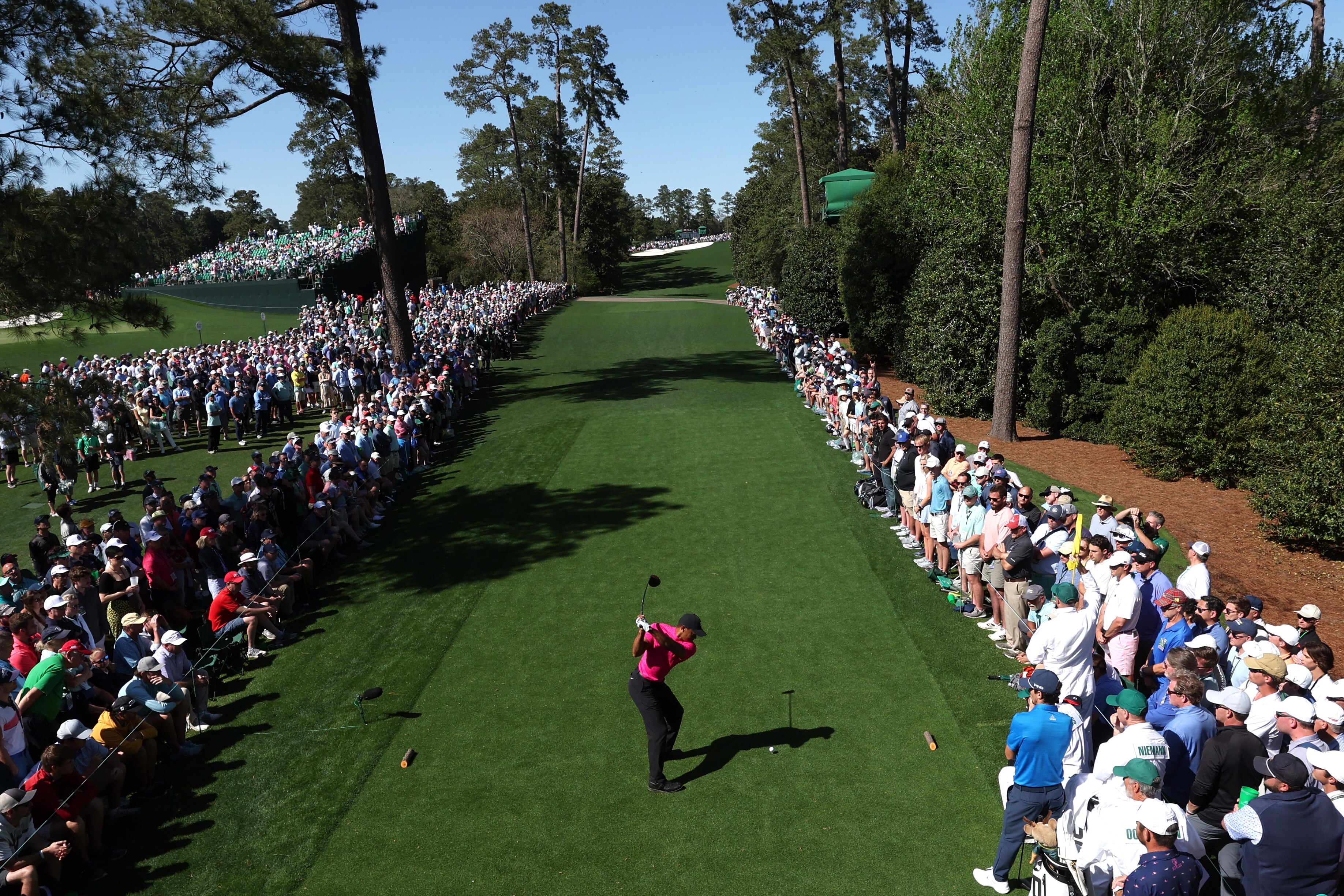 The 46-year-old, wearing a pink shirt and black pants, had his game face on as he walked out to the first tee where the entire length of the par-four 445-yard opening hole was lined with thousands of spectators.
