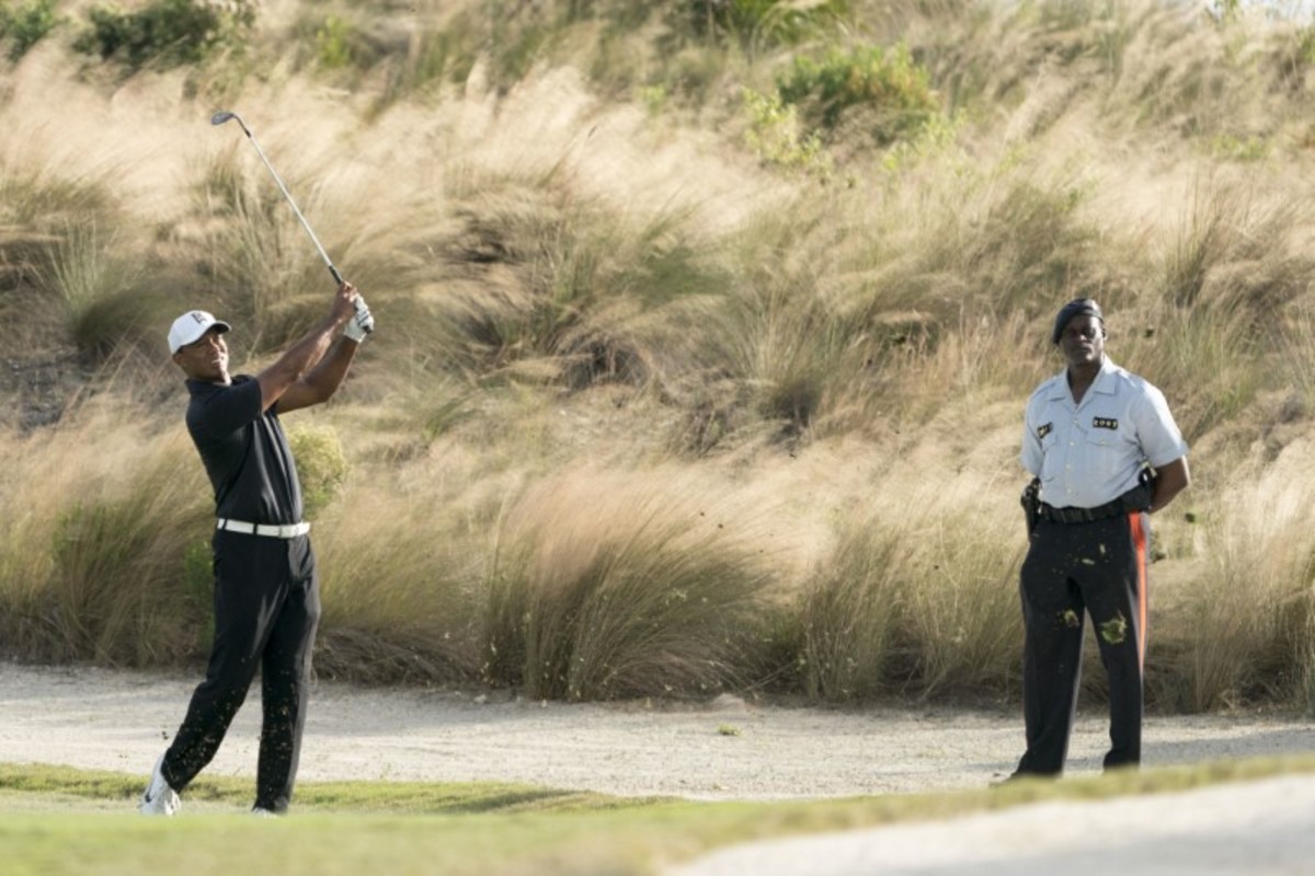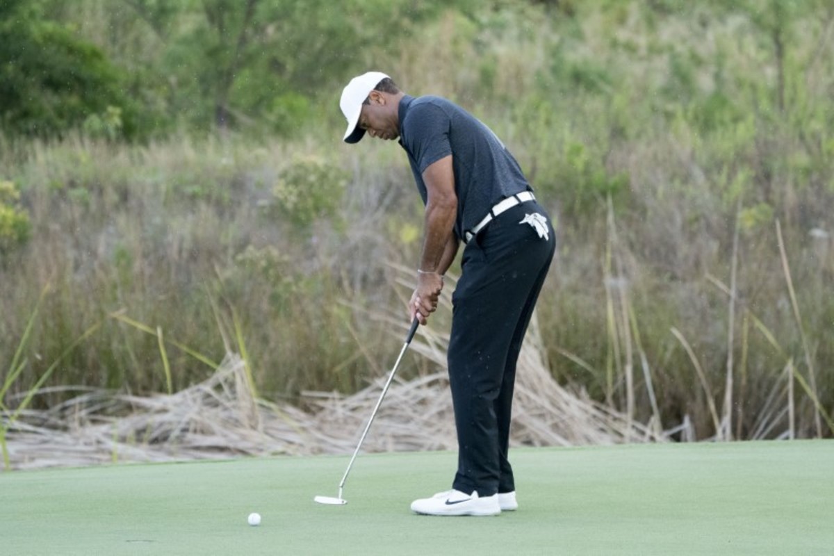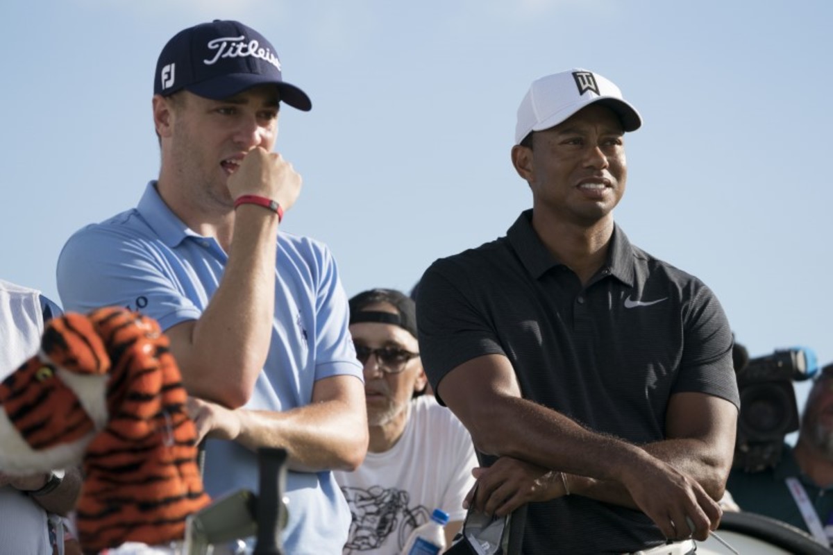 Playing alongside friend and FedExCup champion Justin Thomas, Woods, dressed in black with a white hat, showed his first bit of frustration at the par-five ninth when, after failing to reach the green in two, he made a mess of a chip.