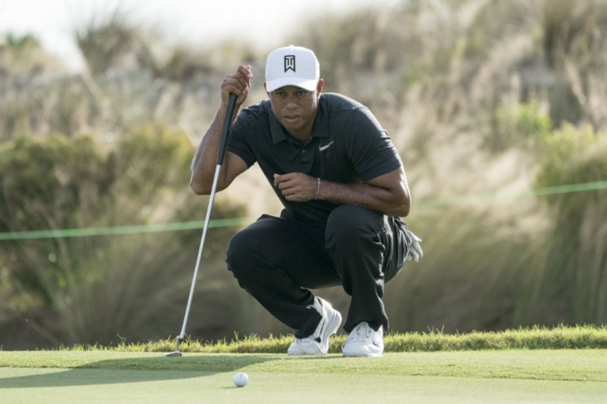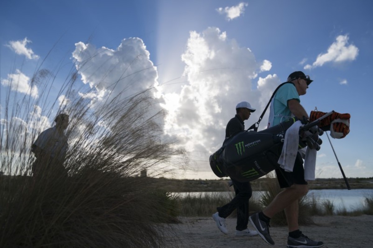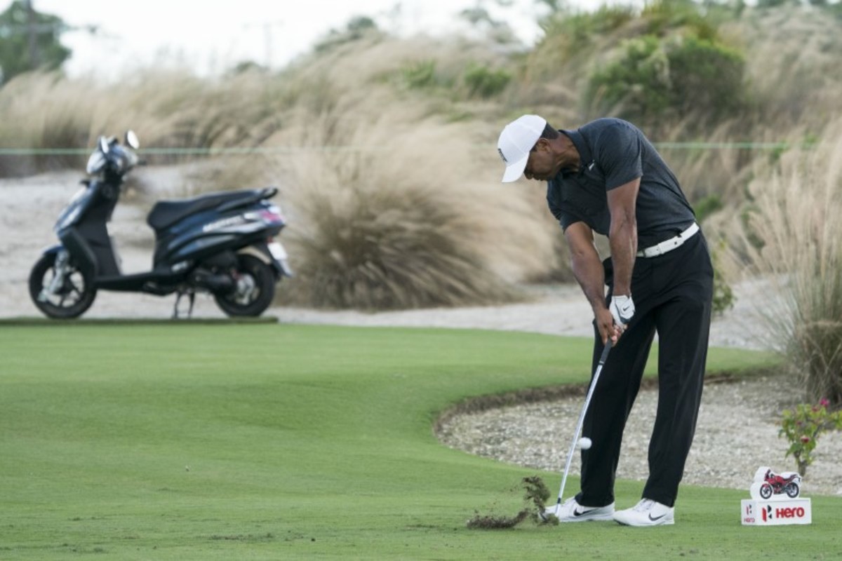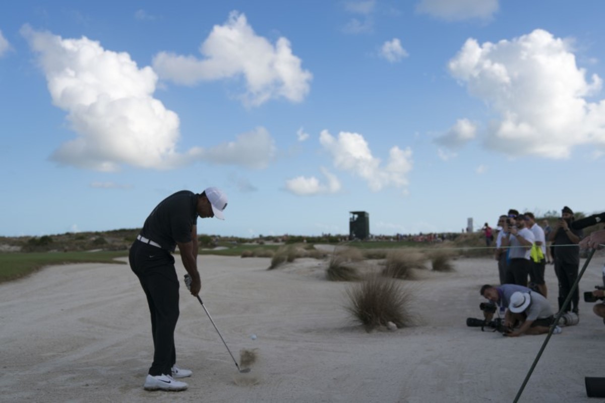 Playing alongside friend and FedExCup champion Justin Thomas, Woods, dressed in black with a white hat, showed his first bit of frustration at the par-five ninth when, after failing to reach the green in two, he made a mess of a chip.
