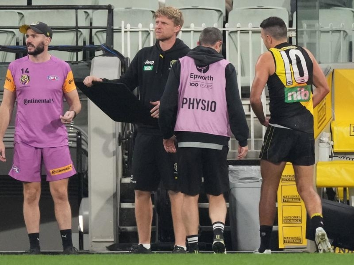 They entered the contest without a host of flag winners as key defender Dylan Grimes (concussion) and star midfield trio Trent Cotchin (hamstring), Dion Prestia and Kane Lambert (both calf) watched from the sidelines.