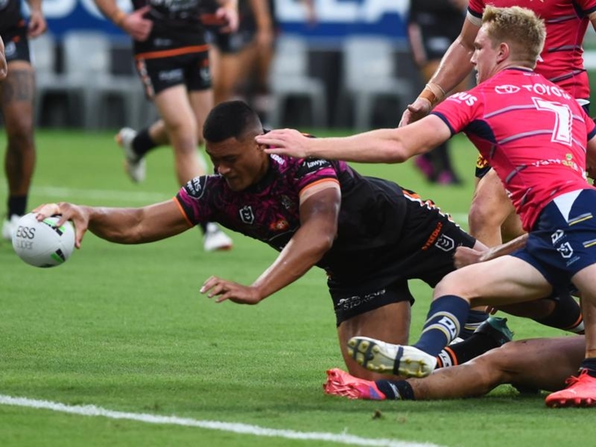 A bizarre try to debutant Jeremiah Nanai five minutes before the break brought the Cowboys to within six points heading into the sheds, but that would be their only try until the 73rd minute and the Tigers held on to see out the result.