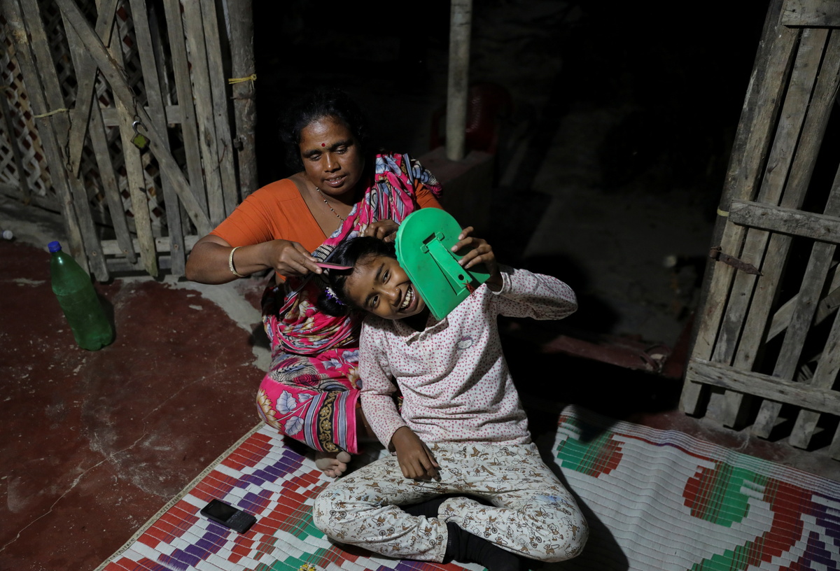 Parul Haldar, 39, whose husband died in a tiger attack during a fishing trip deep inside the forest, combs her 11-year-old daughter Papri Haldar's hair at their home on the island of Satjelia in the Sundarbans, India, November 20, 2020. Almost all of the 2,000 rupees ($27) Haldar makes each month to run her household and send Papri to school comes from fishing and crabbing. "No matter how hard it is, I want to educate her," said Haldar. REUTERS/Anushree Fadnavis SEARCH "FADNAVIS SUNDARBANS" FOR THIS STORY. SEARCH "WIDER IMAGE" FOR ALL STORIES.