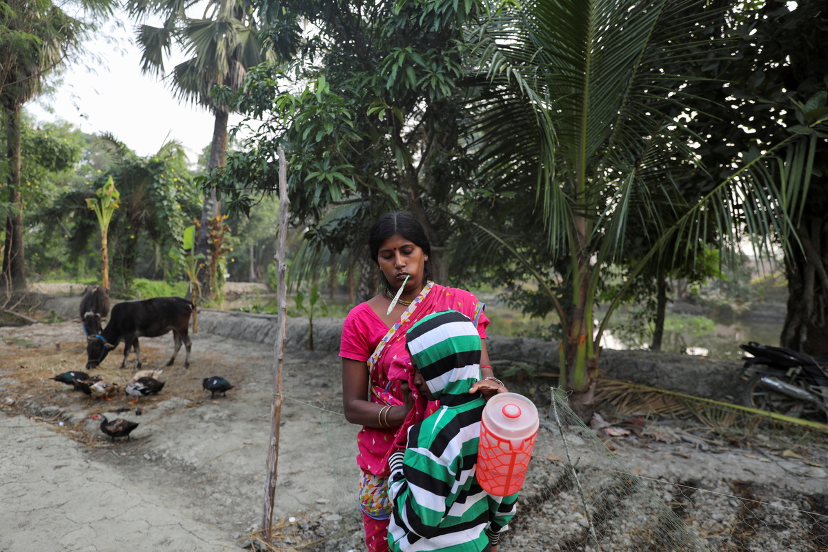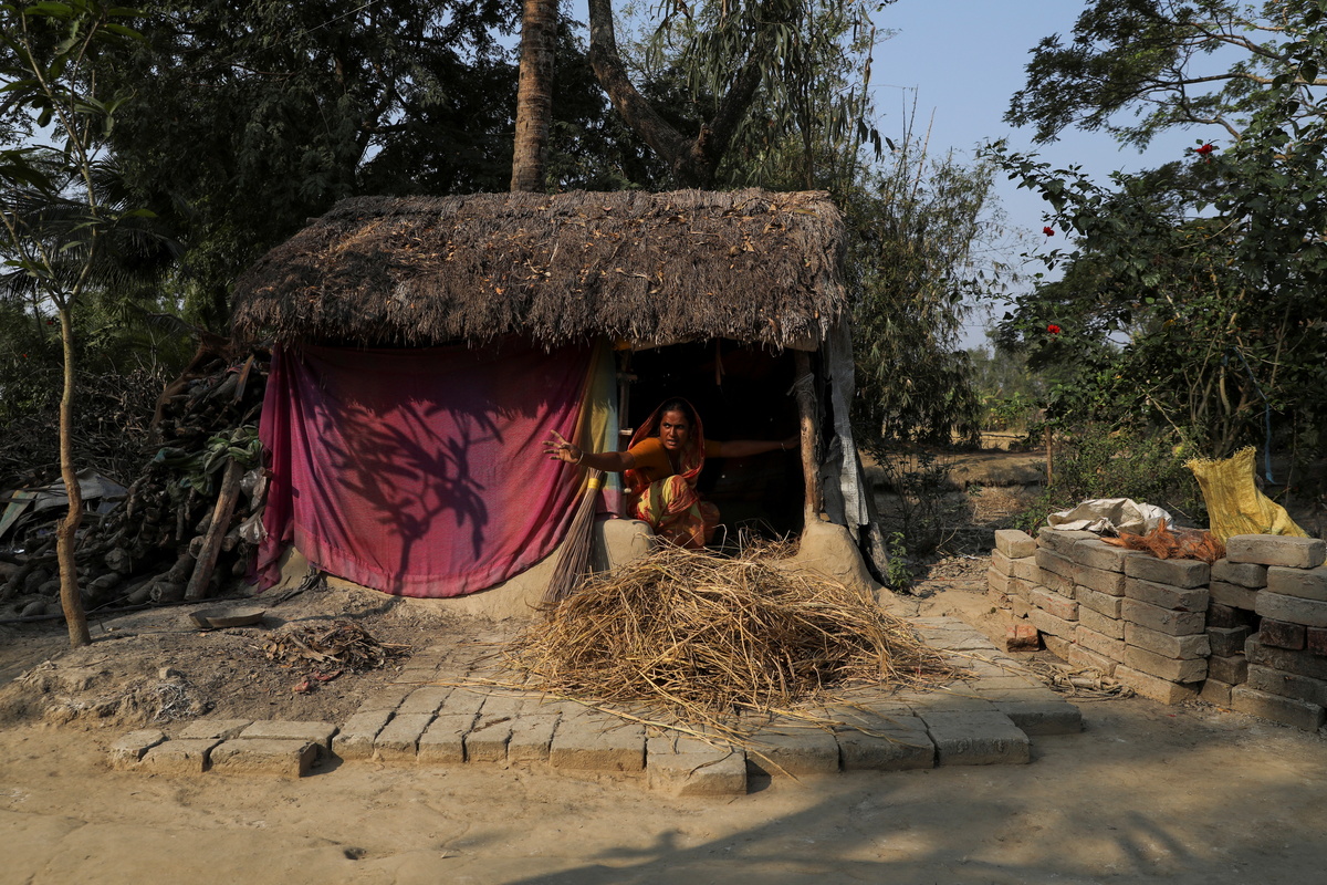 Ashtami Mondal, 30, whose 31-year-old husband Haripada, died in a tiger attack when he went fishing on the rivers encircling Kumirmari during a nationwide lockdown to prevent the spread of the coronavirus disease (COVID-19), cleans utensils in a pond next to her home on the island of Kumirmari in the Sundarbans, India, November 19, 2020. Haripada, the sole breadwinner, returned home from a construction job in mid-March, his family said, days before India's government announced the nationwide lockdown. "He said he would go nearby to fish and make 50-100 rupees to help with household expenses," Ashtami said. He left home before dawn, rowed into the forests and was killed. "If there was no lockdown or no coronavirus, he would have left here to work." REUTERS/Anushree Fadnavis