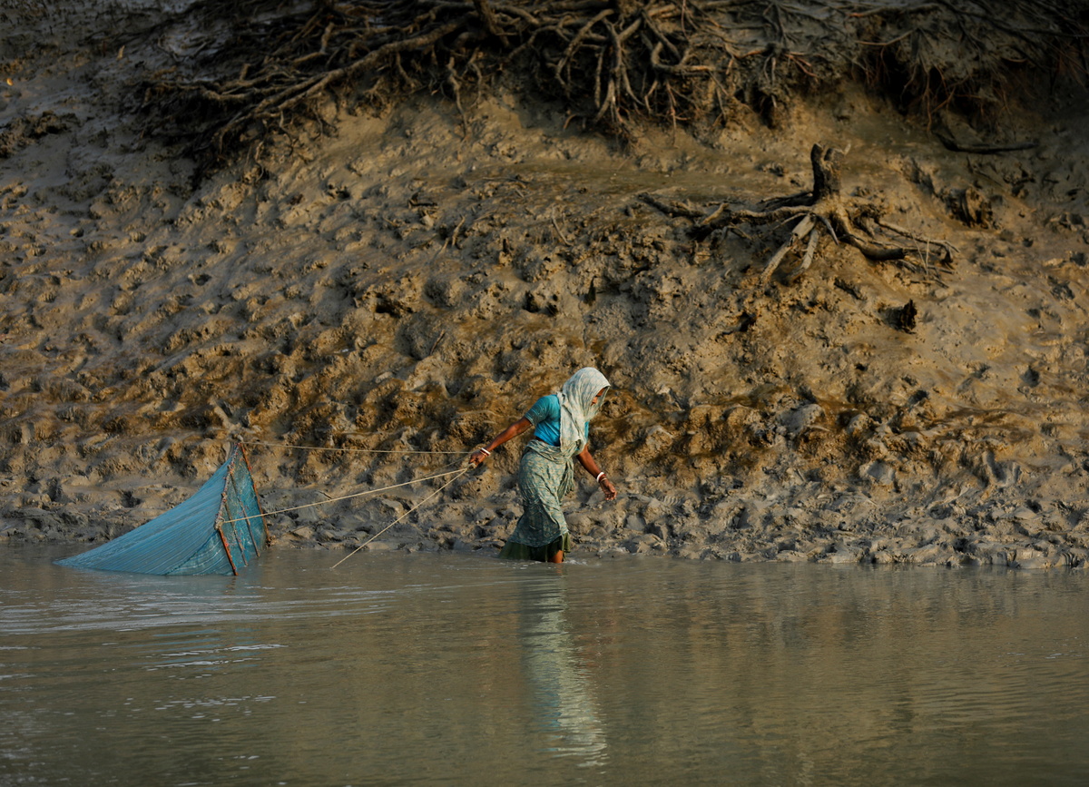 A woman fishes along the banks of a river near the island of Satjelia in the Sundarbans, India, December 16, 2019. REUTERS/Anushree Fadnavis