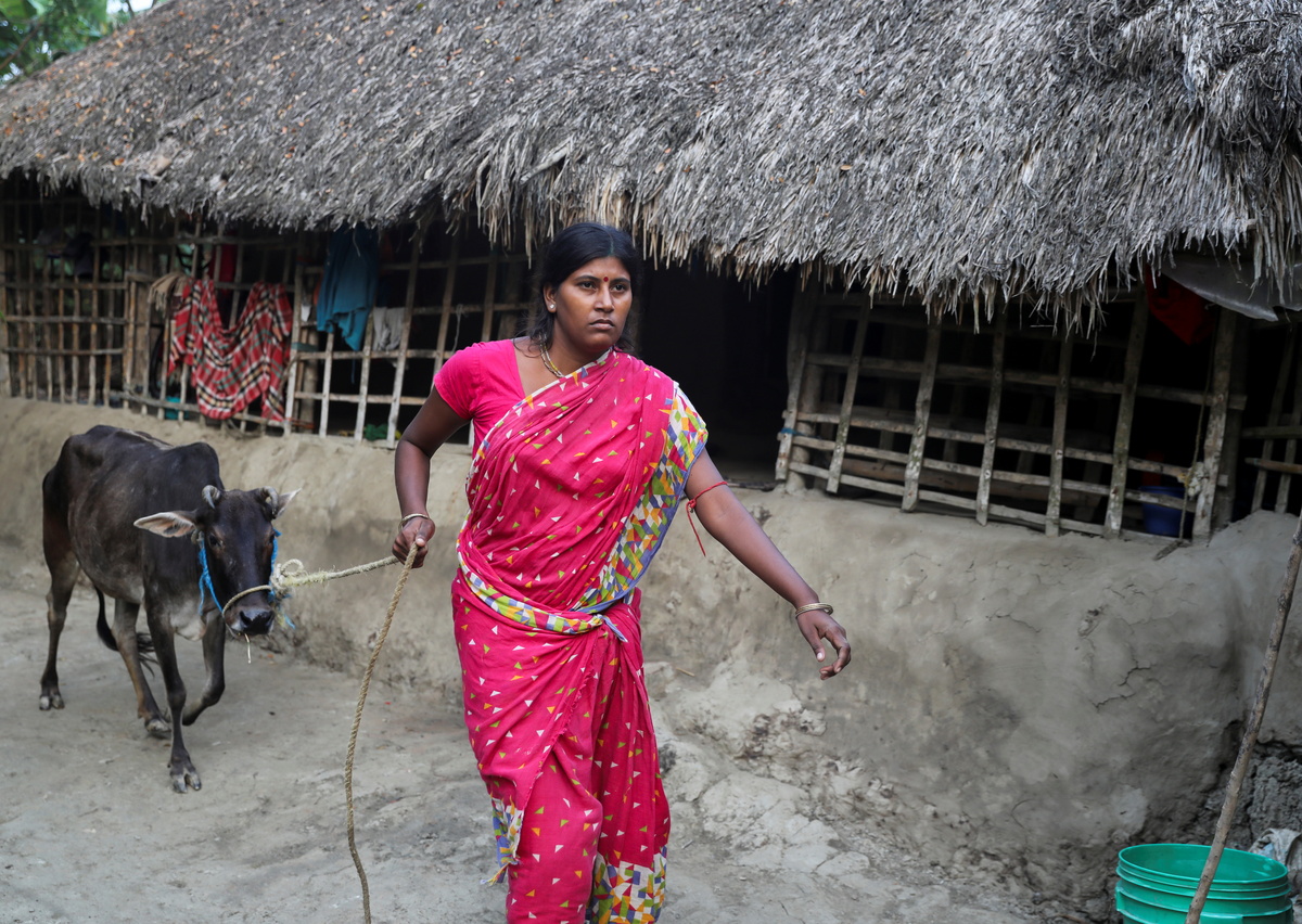 Ashtami Mondal, 30, whose 31-year-old husband Haripada, died in a tiger attack when he went fishing on the rivers encircling Kumirmari during a nationwide lockdown to prevent the spread of the coronavirus disease (COVID-19), takes her cow to graze, by her home on the island of Kumirmari in the Sundarbans, India, November 19, 2020. Haripada, the sole breadwinner, returned home from a construction job in mid-March, his family said, days before India's government announced the nationwide lockdown. "He said he would go nearby to fish and make 50-100 rupees to help with household expenses," Ashtami said. He left home before dawn, rowed into the forests and was killed. "If there was no lockdown or no coronavirus, he would have left here to work." REUTERS/Anushree Fadnavis