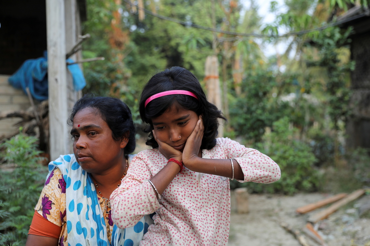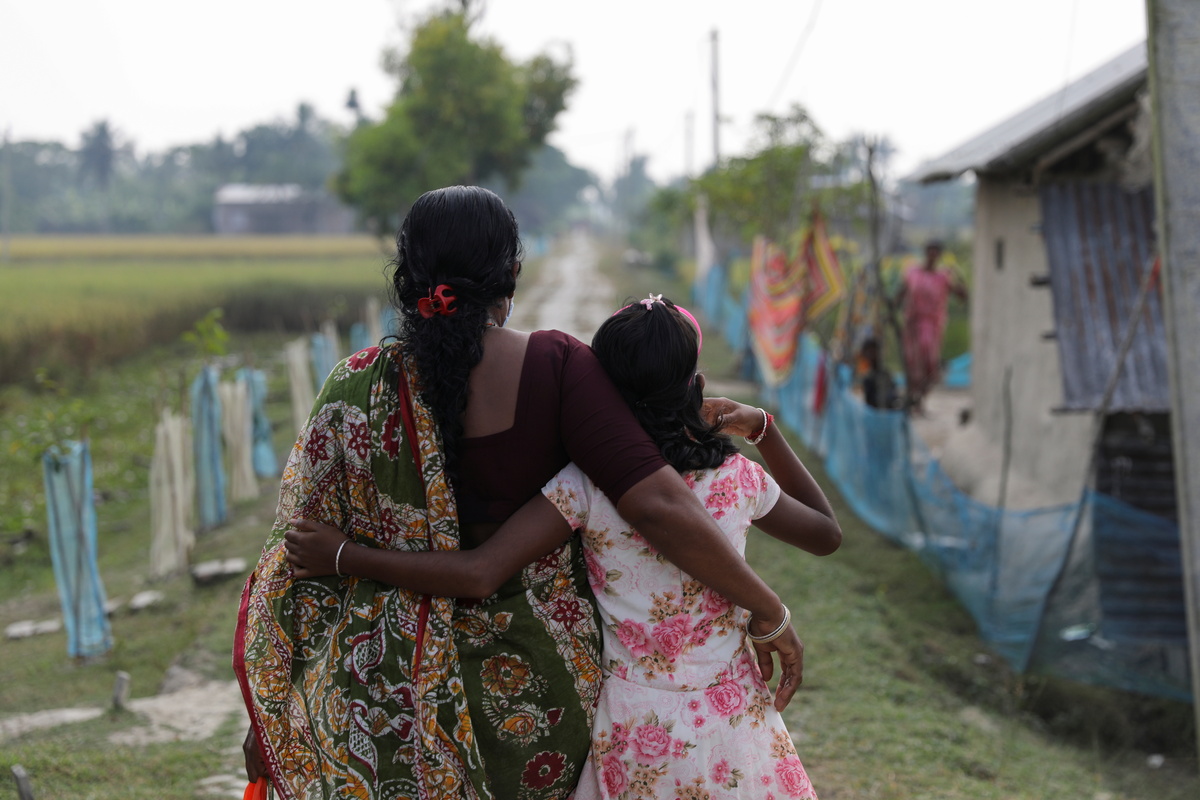 Parul Haldar, 39, whose husband died in a tiger attack during a fishing trip, and her daughter Papri Haldar, 11, walk on the island of Satjelia in the Sundarbans, India, November 20, 2020. Almost all of the 2,000 rupees ($27) Haldar makes each month to run her household and send Papri to school comes from fishing and crabbing. "No matter how hard it is, I want to educate her," said Haldar. REUTERS/Anushree Fadnavis