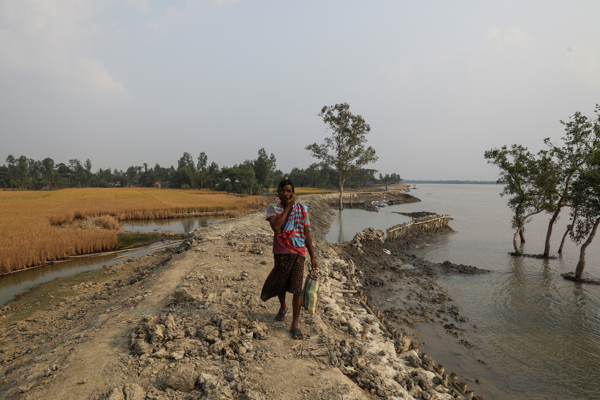 Nagin Munda, 50, a farmer, walks past an embankment on the island of Kumirmari in the Sundarbans, India, November 19, 2020. "I have no fish left in my pond, no vegetables in my garden, and half my paddy crop is gone," said Munda. REUTERS/Anushree Fadnavis