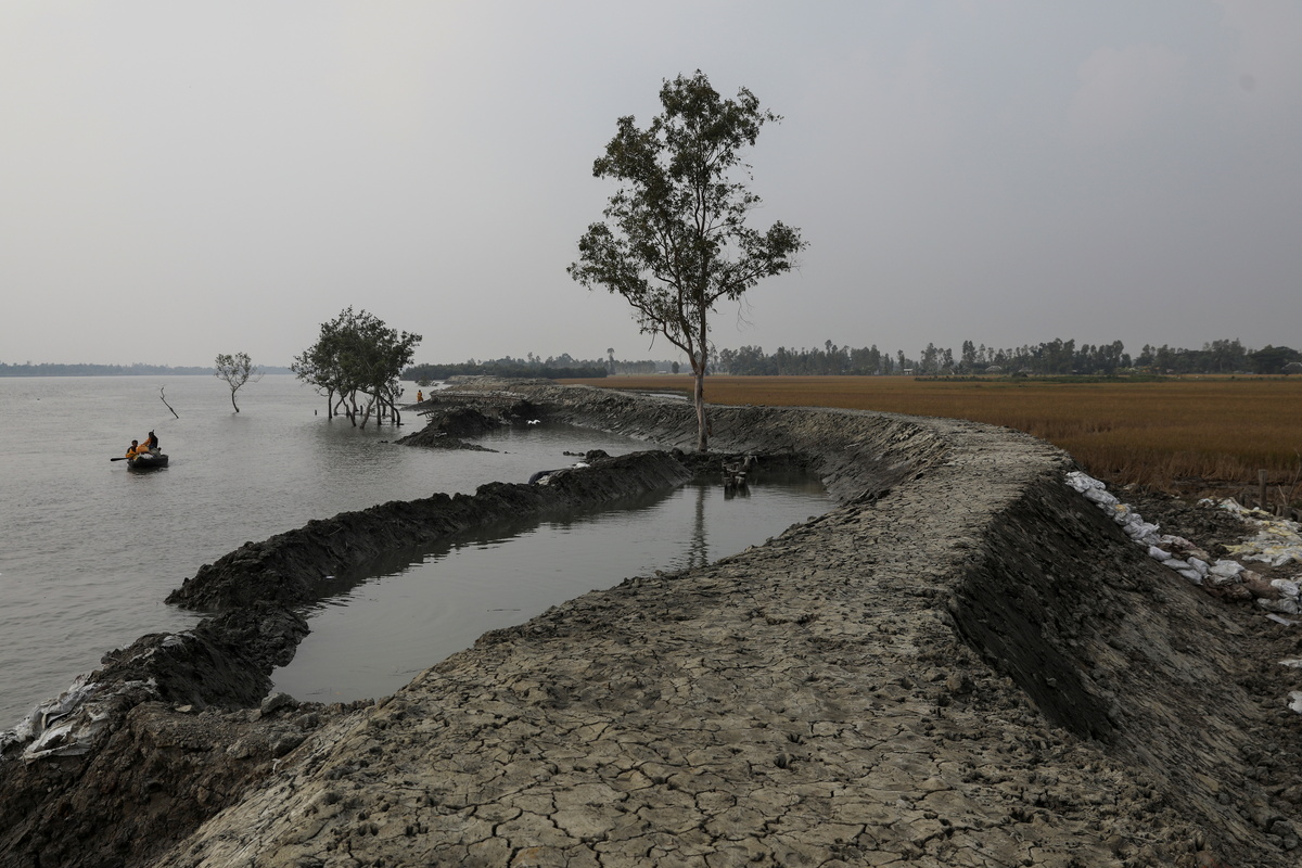 A boat rows past a broken embankment on the island of Kumirmari in the Sundarbans, India, November 19, 2020. REUTERS/Anushree Fadnavis
