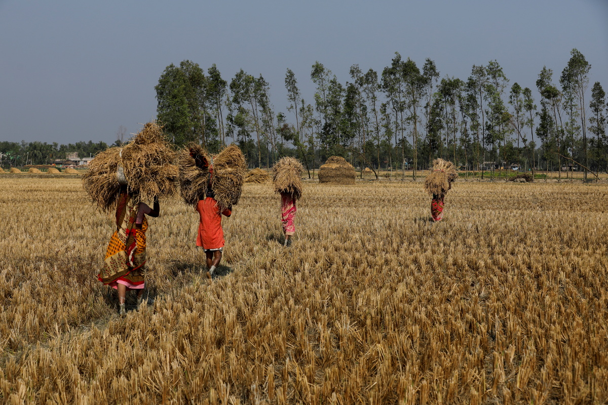 A woman and a boy harvest rice using a thresher machine on the island of Satjelia in the Sundarbans, India, December 15, 2019. REUTERS/Anushree Fadnavis