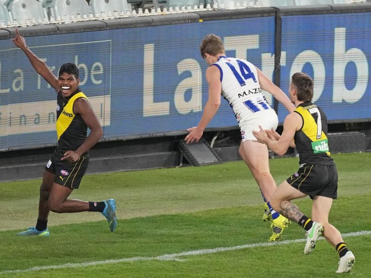 In an added boost for Richmond, father-son recruit Maurice Rioli Jnr kicked a goal on his AFL debut and only improved as the game went on.