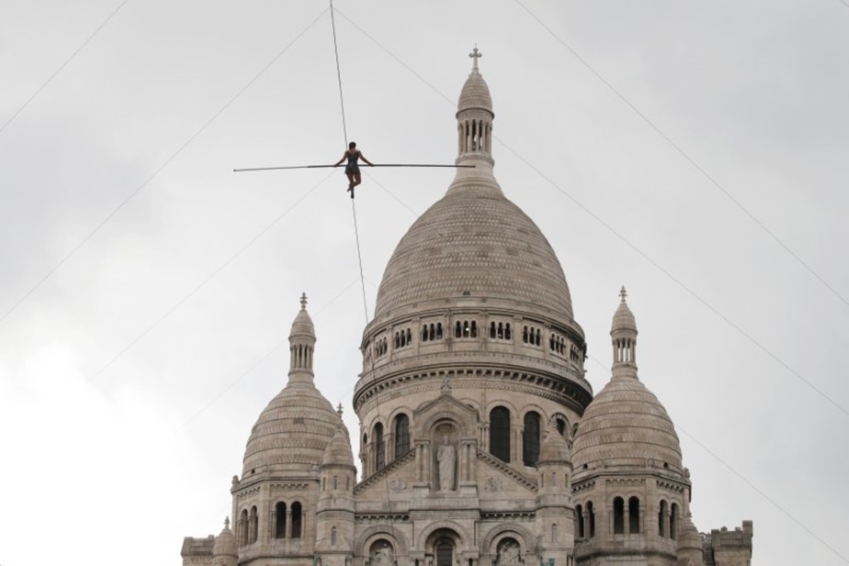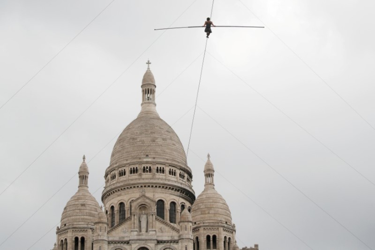 Bongonga, 34, walked on a rope suspended by a crane at the base of the hill's steps toward the Sacre Coeur basilica accompanied by a chamber orchestra, without any security equipment, a gesture many in the audience found nerve-wracking.