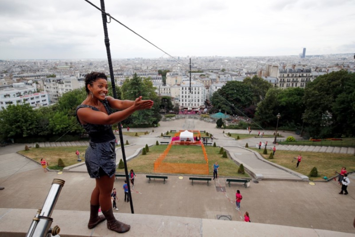 Tightrope walker Tatian-Mosio Bongonga advances on a tightrope as she scales the Monmartre hill towards the Sacre Coeur Basilica in Paris, France, July 20, 2018. REUTERS/Philippe WojazerTightrope walker Tatian-Mosio Bongonga reacts after she scaled the Monmartre hill towards the Sacre Coeur Basilica (not pictured) on a tightrope in Paris, France, July 20, 2018. REUTERS/Philippe WojazerTightrope walker Tatian-Mosio Bongonga advances on a tightrope as she scales the Monmartre hill towards the Sacre Coeur Basilica in Paris, France, July 20, 2018. REUTERS/Philippe WojazerTIghtrope walker Tatian-Mosio Bongonga stretches as she warms-up before walking a tightrope on the Monmartre hill below the Sacre Coeur Basilica in Paris, France, July 20, 2018. REUTERS/Philippe WojazerTIghtrope walker Tatian-Mosio Bongonga stretches as she warms-up before walking a tightrope on the Monmartre hill below the Sacre Coeur Basilica in Paris, France, July 20, 2018. REUTERS/Philippe WojazerTIghtrope walker Tatian-Mosio Bongonga stretches as she warms-up before walking a tightrope on the Monmartre hill below the Sacre Coeur Basilica in Paris, France, July 20, 2018. REUTERS/Philippe WojazerTIghtrope walker Tatian-Mosio Bongonga prepares to walk a tightrope on the Monmartre hill below the Sacre Coeur Basilica in Paris, France, July 20, 2018. REUTERS/Philippe Wojazer
