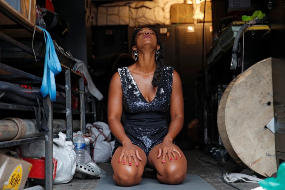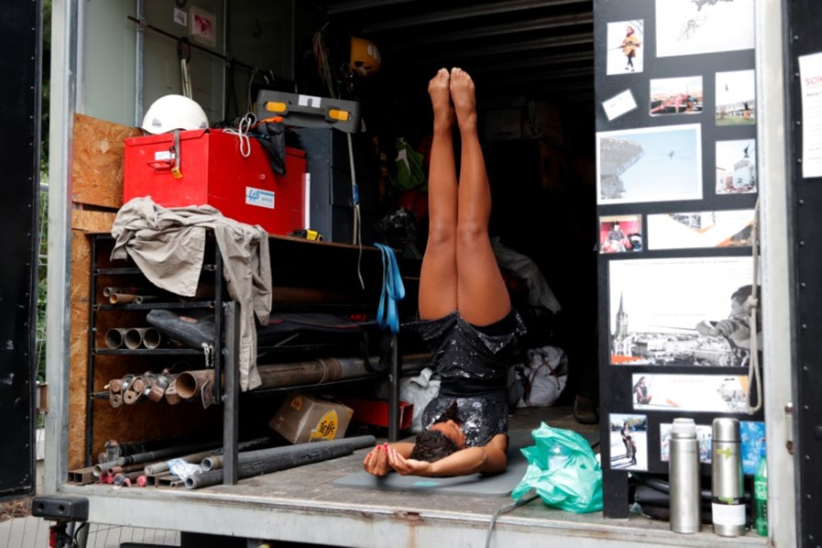 Tightrope walker Tatian-Mosio Bongonga hangs from a tightrope as she pauses while scaling the Monmartre hill towards the Sacre Coeur Basilica (not pictured) in Paris, France, July 20, 2018. REUTERS/Philippe Wojazer