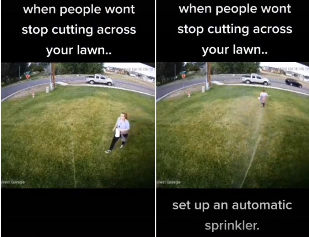 Another clip shows two kids walking through the lawn, a decision they would also come to regret as the two trespassers were also soaked when the sprinklers turn on, and they too pelted off the grass.
