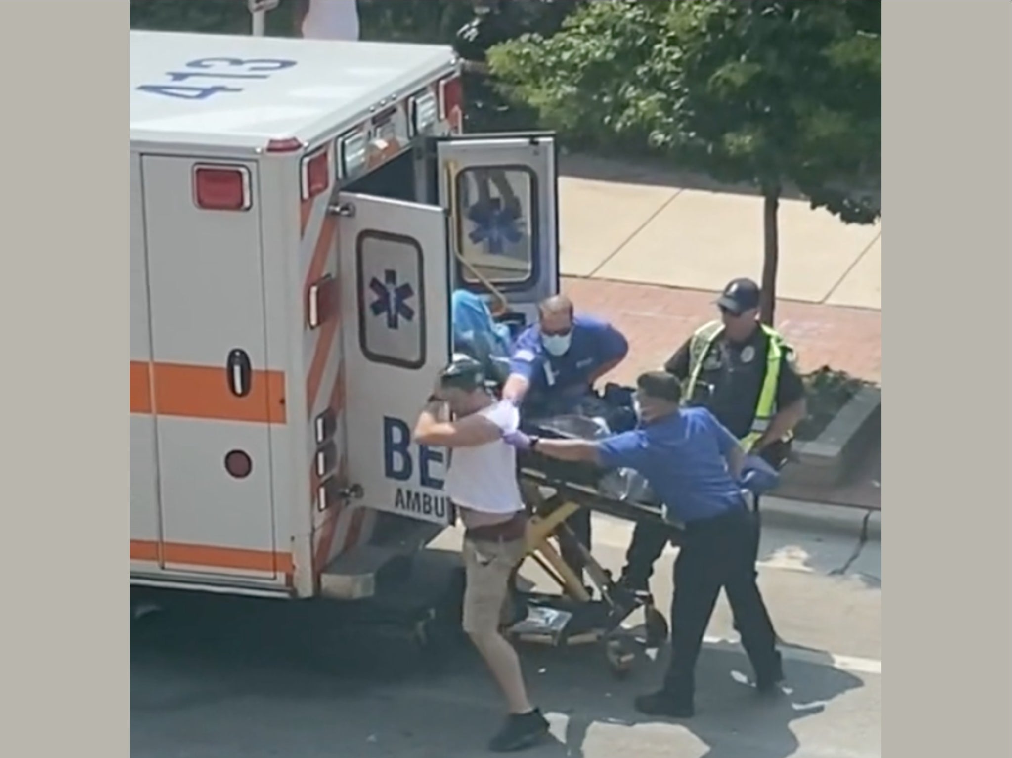 The clip shows a man leaping from an ambulance stretcher and away from paramedics before fleeing up the street.