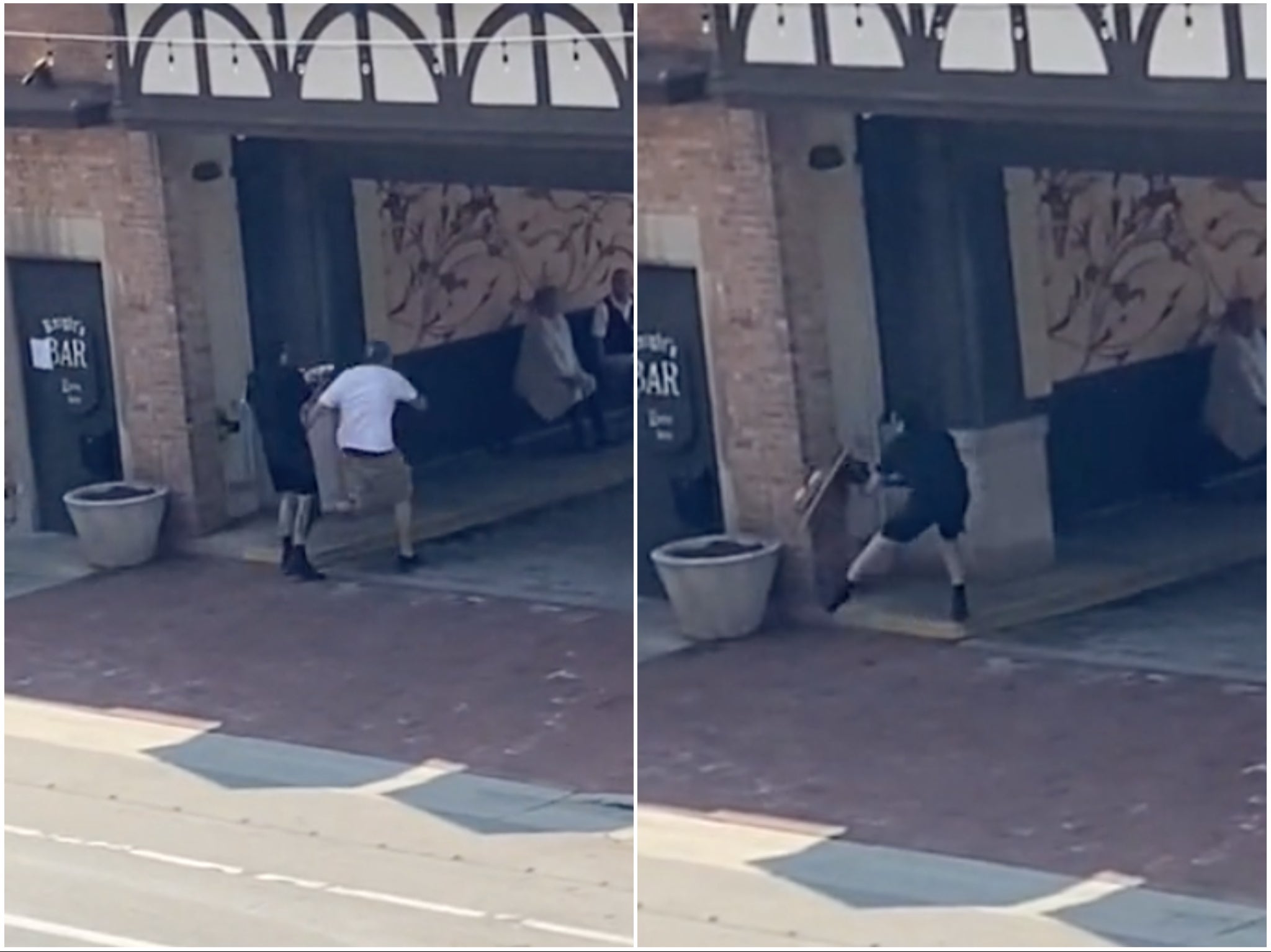 He then crashes into what appears to be a restaurant worker carrying a tray of food before toppling over in a back alley.