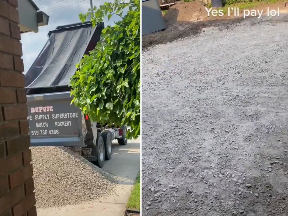 In the first video, which you can watch in full here, she shows the large truck in her front drive as it pours out an enormous pile of stones out of the back.