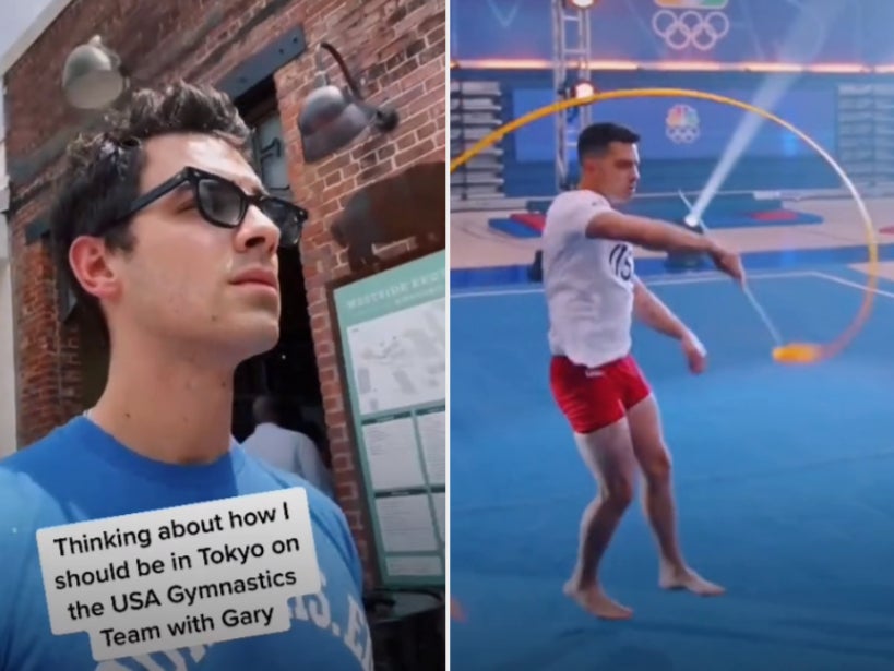 The Jonas Brother videoed himself looking downcast as the text said: “Thinking about how I should be in Tokyo on the USA Gymnastics Team with Gary.”