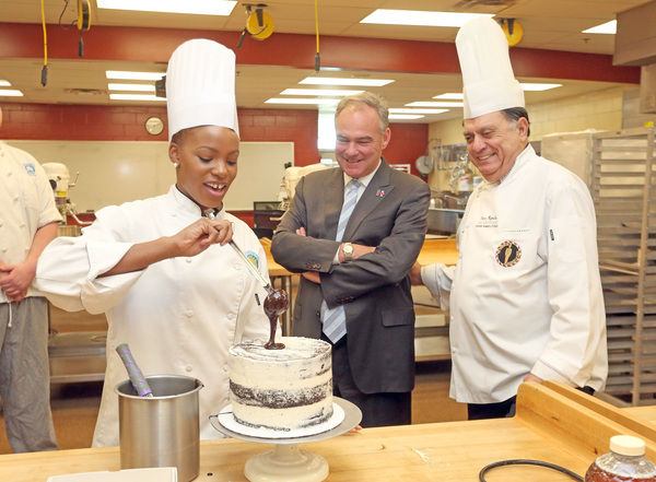 "Programs like this are very, very special to me," Kaine said, adding that he grew up in a house with an iron-welding shop with "superbly trained technical artists. And I learned about the power of career technical education."