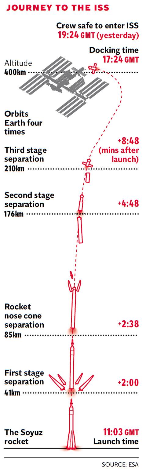 It took a further six hours for the Soyuz spacecraft to catch up with its quarry, itself travelling at 17,500mph and orbiting the Earth at an average altitude of 220 miles. During the final approach, the docking probe of the Soyuz was captured by a series of hooks and latches to the docking cone of the ISS.