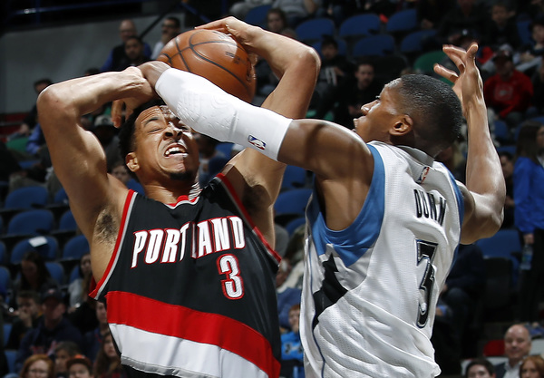 Out of a time out, Rubio drove but was blocked at the rim by Aminu. The Wolves got the rebound, but Wiggins' 3-pointer didn't foul with 4.9 left. Portland in-bounded the ball to Lillard, but his shot bounced out at the buzzer.