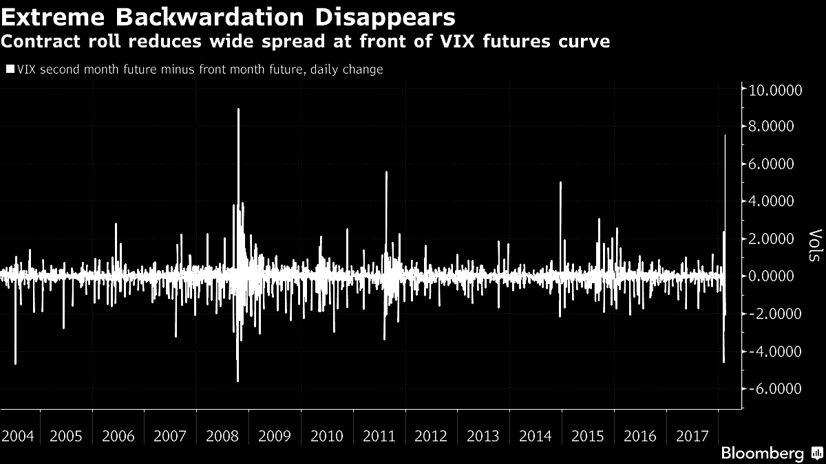 The enormous spread between front and second-month VIX futures contracts, which are tied to the Cboe Volatility Index, was a barometer of just how roiled the market was during the recent downturn. It also caused severe pain (and in one case, death) for some products linked to the VIX.