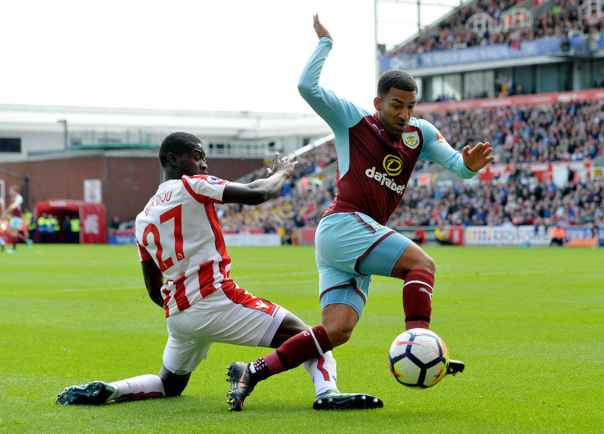 Soccer Football - Premier League - Stoke City v Burnley - bet365 Stadium, Stoke-on-Trent, Britain - April 22, 2018 Stoke City's Papa Ndiaye in action with Burnley's Aaron Lennon REUTERS/Peter Powell